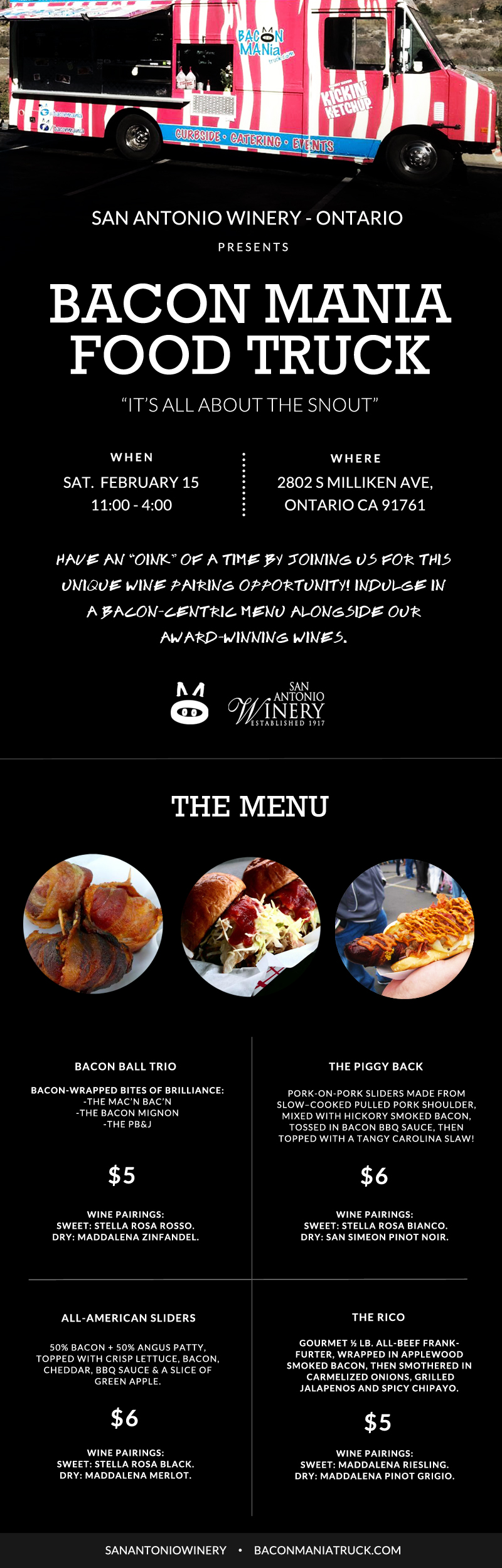 That’s why San Antonio Winery is “pairing” with us to bring you the ultimate BACON-lovers dream date this Saturday, February 15th from 11am-4pm in Ontario.