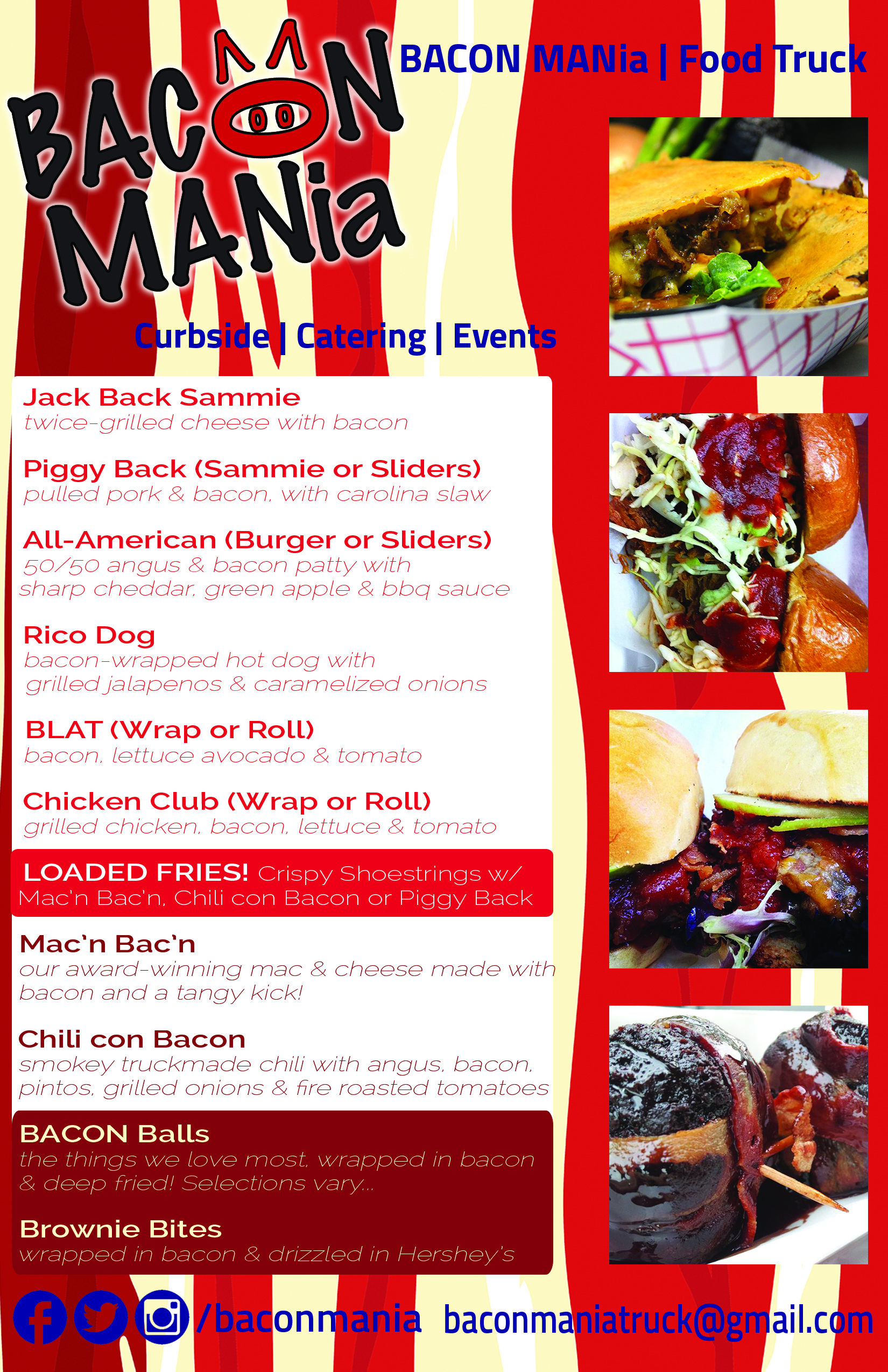 While our menu continues to grow and evolve on a daily basis, here’s the kind of choices you’ll typically find during a Bacon Mania Truck lunch or dinner stop!